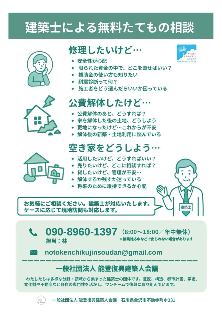 「どうしたらいいのか分からない」たてものの悩みを、建築士が無料でご相談に応じます。