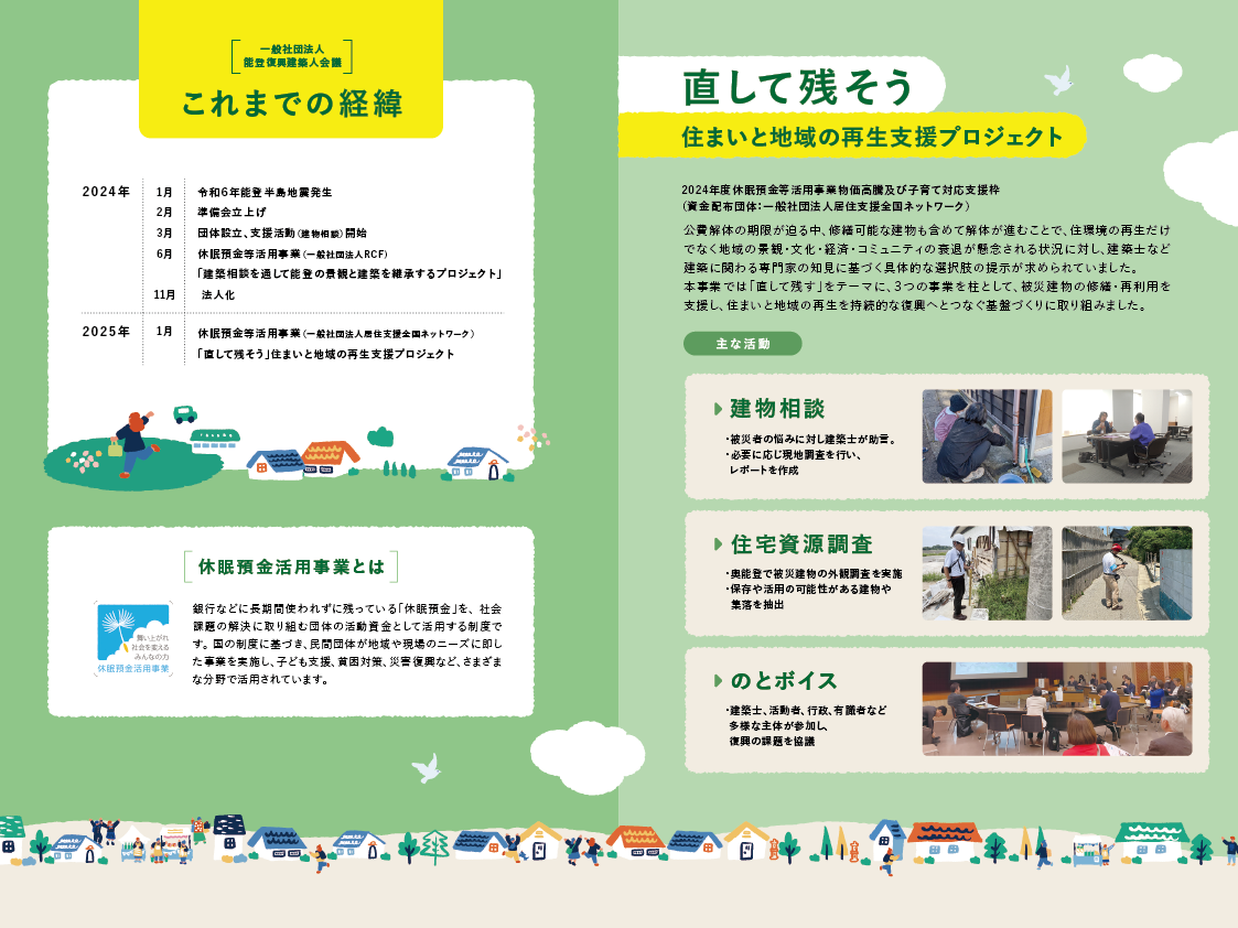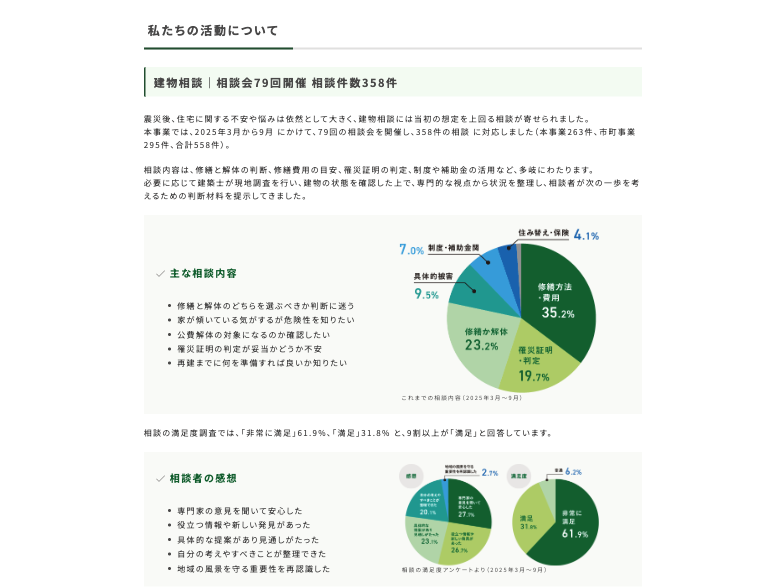 「直して残す」をテーマに、3つの事業を柱として、被災建物の修繕・再利用を支援し、住まいと地域の再生を持続的な復興へとつなぐ基盤づくりに取り組みました。
